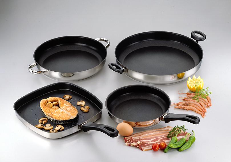 1985 – A mediados de los 80, comenzamos con la fabricación de las primeras sartenes. Las de Acero Inoxidable con revestimiento antiadherente son nuestra pieza estrella. La oferta se va ampliando con asadores, paelleras, woks,.. sartenes sin revestimiento, de aluminio,…