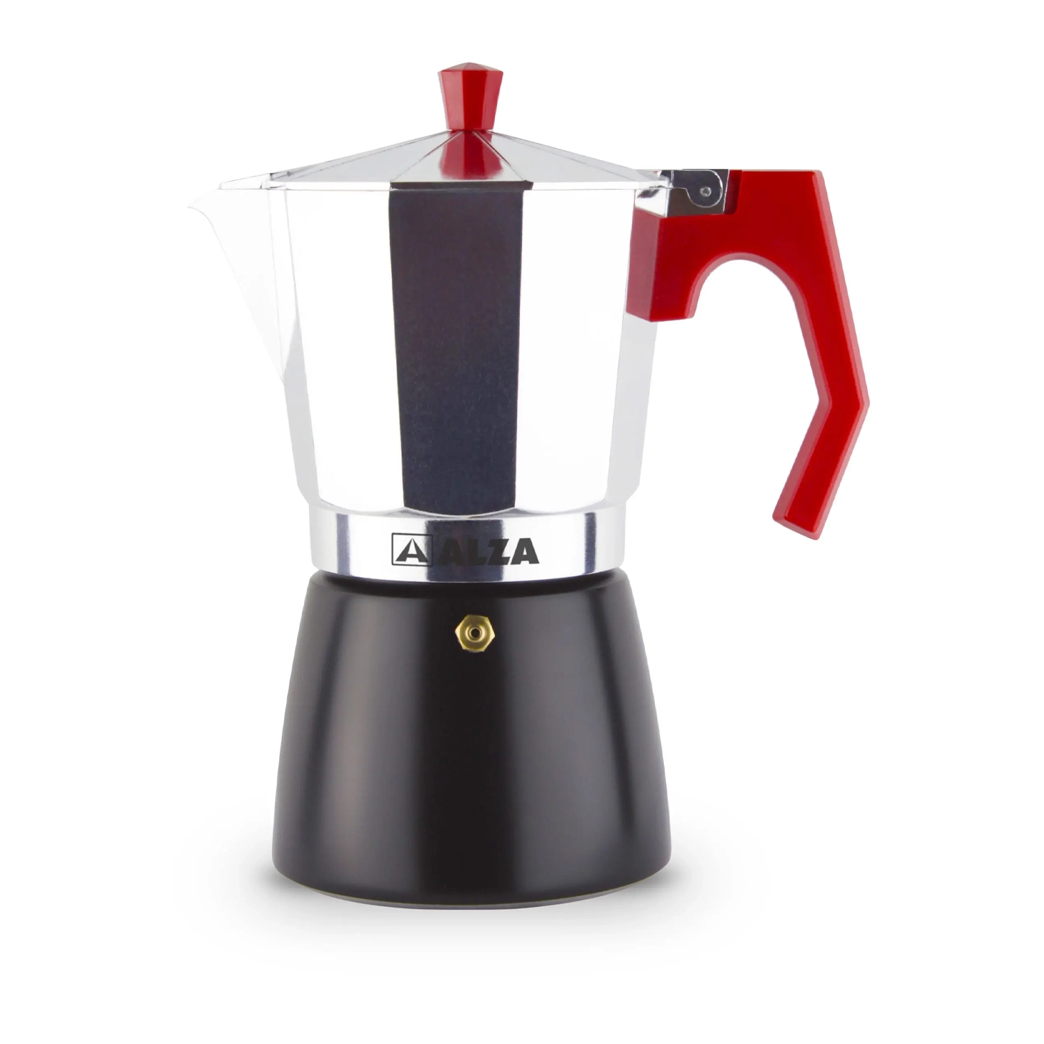 Cafetera fabricada en aluminio de alta calidad. El cuerpo superior presenta un acabado metálico con la marca ALZA grabada, mientras que la base incorpora un revestimiento negro. El mango y el pomo destacan por su atractivo color rojo.