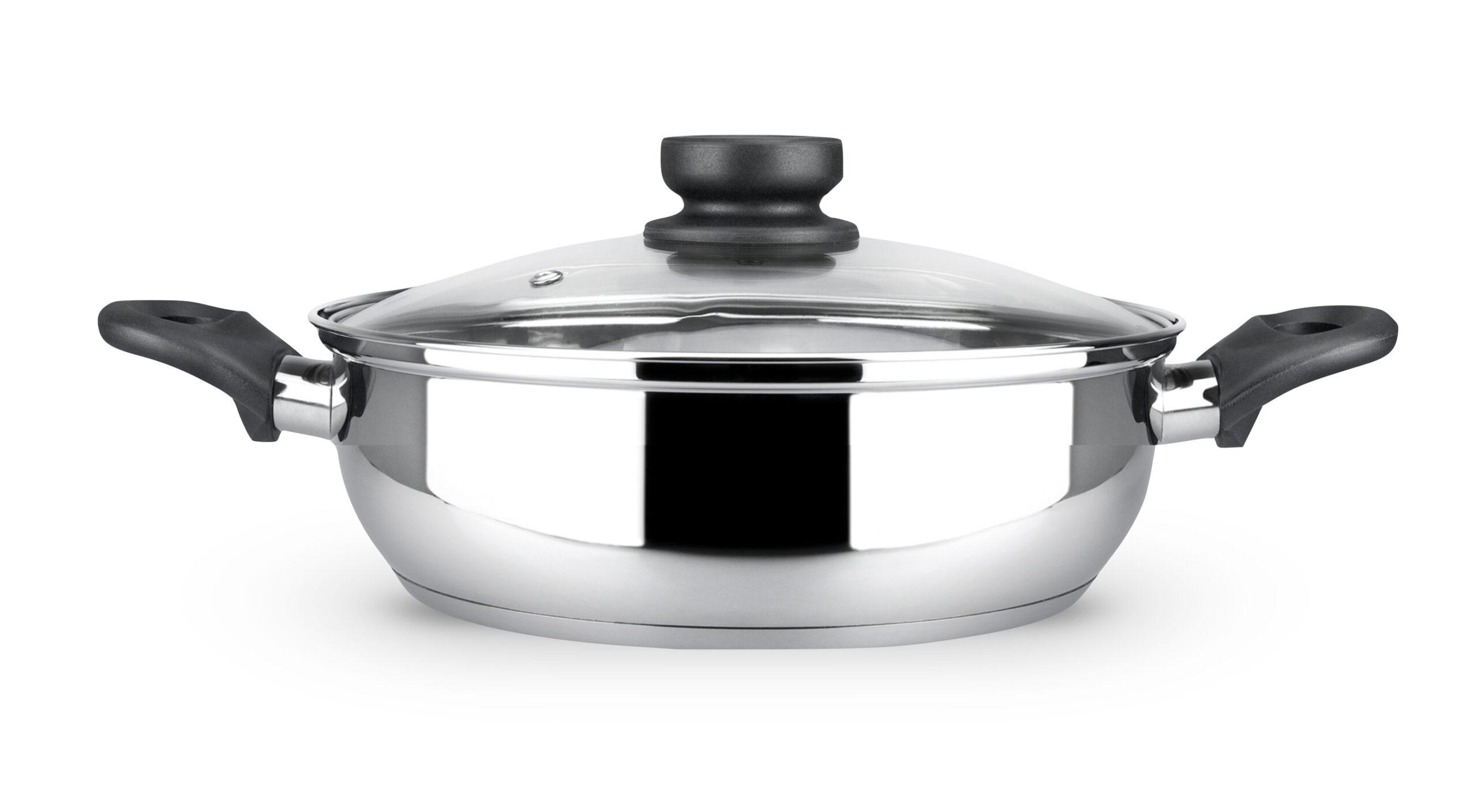 Tapa de cristal termoresistente, con borde de acero inoxidable y válvula desvaporizadora, que permite controlar la cocción sin destapar la pieza.