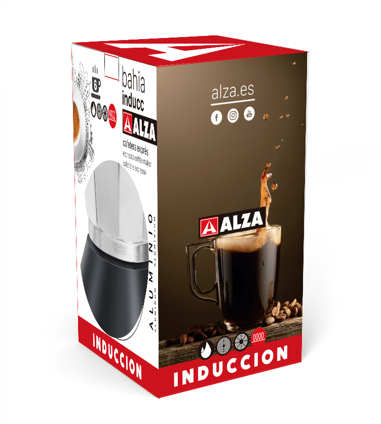 Cafetera moka, fabricada en Aluminio, en colorido diseño tricolor, válida para Gas, Electricidad, Vitrocerámica e Inducción.