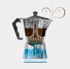 Su proceso de elaboración consiste en pasar por 3 cámaras. El agua en la cámara inferior hierve, y el vapor causa presión que empuja el agua hacia arriba a través de los posos del café hacia la cámara superior.