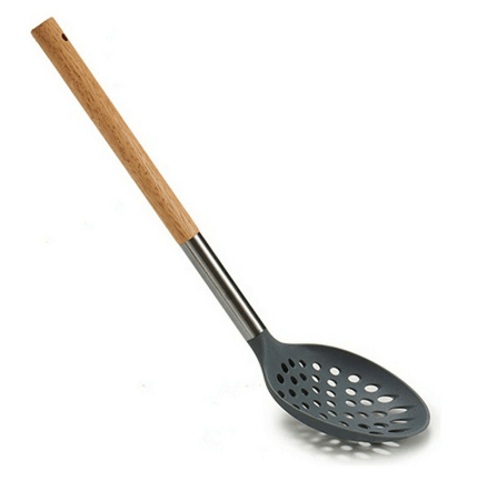 Utensilios de cocina de madera de acacia, nylon y acero inoxidable.